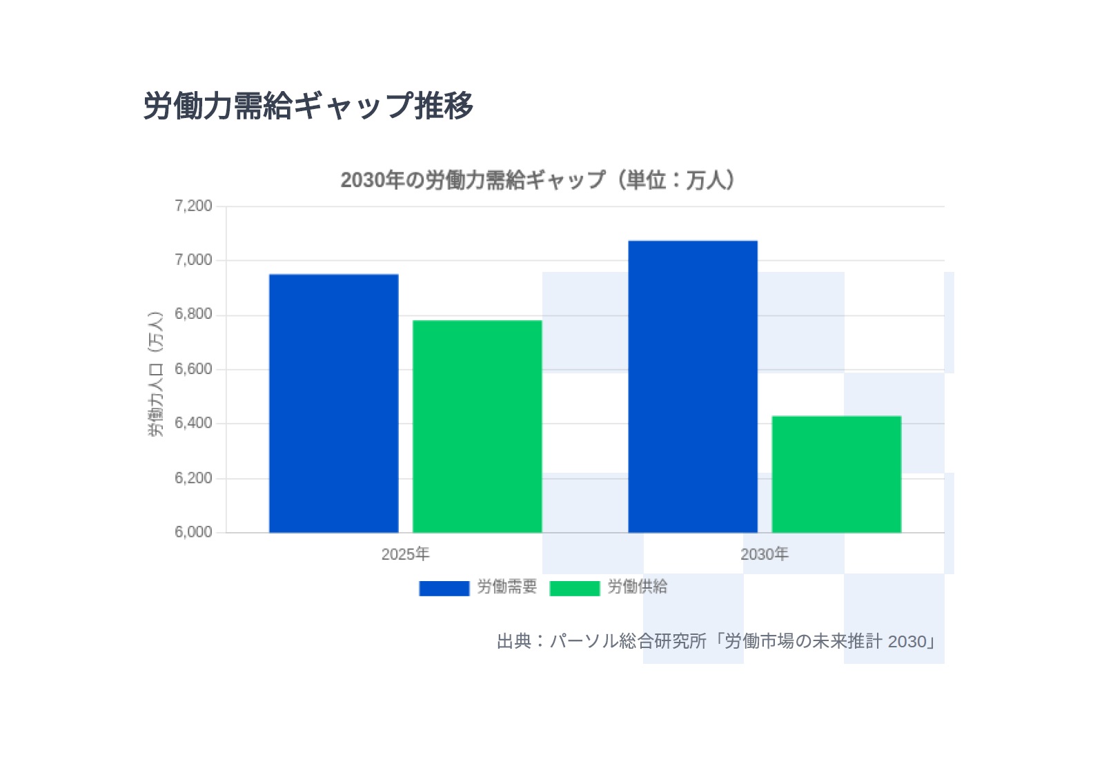 パーソル総合研究所の調査によると、2030年までに日本では644万人の労働力が不足すると予測されています。これは東京都の人口の約半分に相当する規模です。
