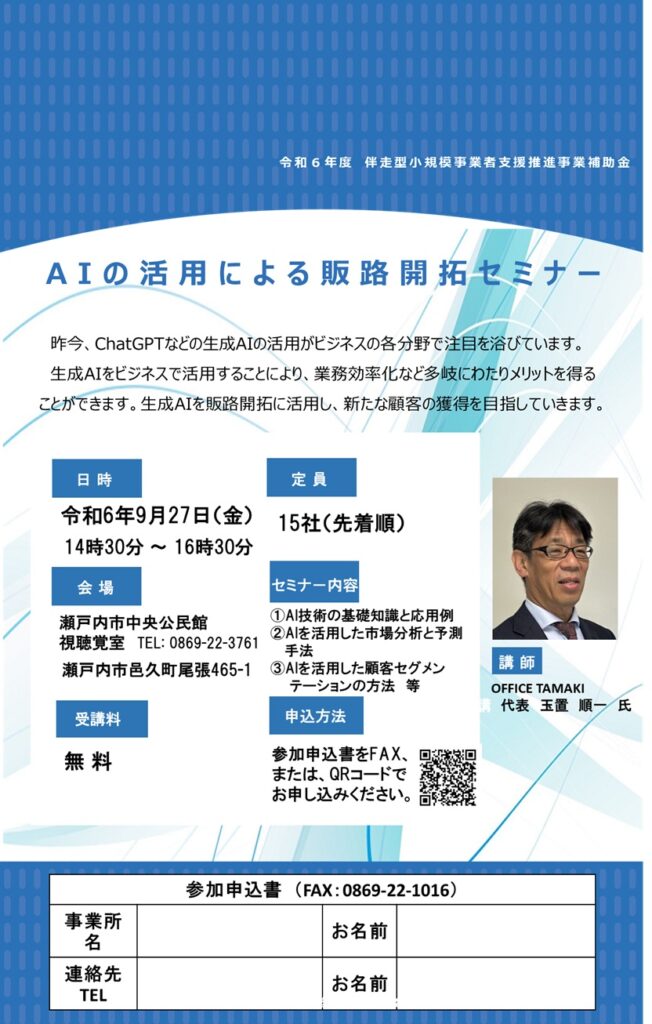 [瀬戸内市] 瀬戸内市商工会 令和6年度伴走型小規模事業者支援推進事業 「AIの活用による販路開拓セミナー 瀬戸内市事業者のための実践ガイド」