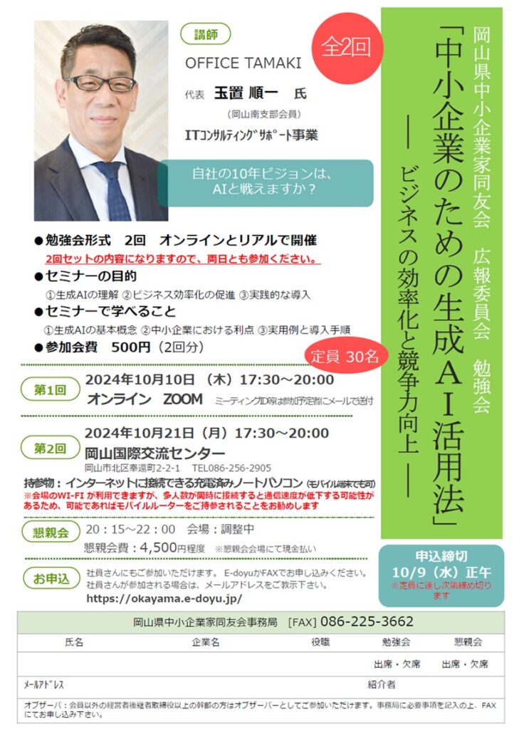 岡山県中小企業家同友会広報委員会様からのご依頼により、全2回シリーズの「中小企業のための生成AI活用法―ビジネスの効率化と競争力向上」勉強会を実施いたしました。